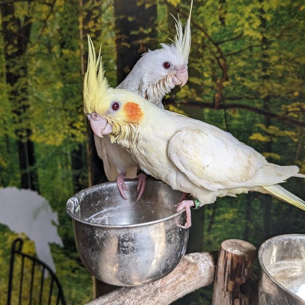 This is a good shot of 2 juvenile lutinos showing their red eye color. these girls were just under 2 months of age. The one in the front is a normal lutino and the one in the back is a whiteface lutino.