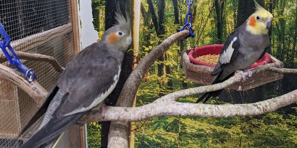 This is a pair of normal, aka wild type, cockatiels. The female has a darker face compared to the male. This is a dominant trait and all normal grey chicks start out looking female. After 6-9 months the chicks molt and males will develop the bright yellow face.
