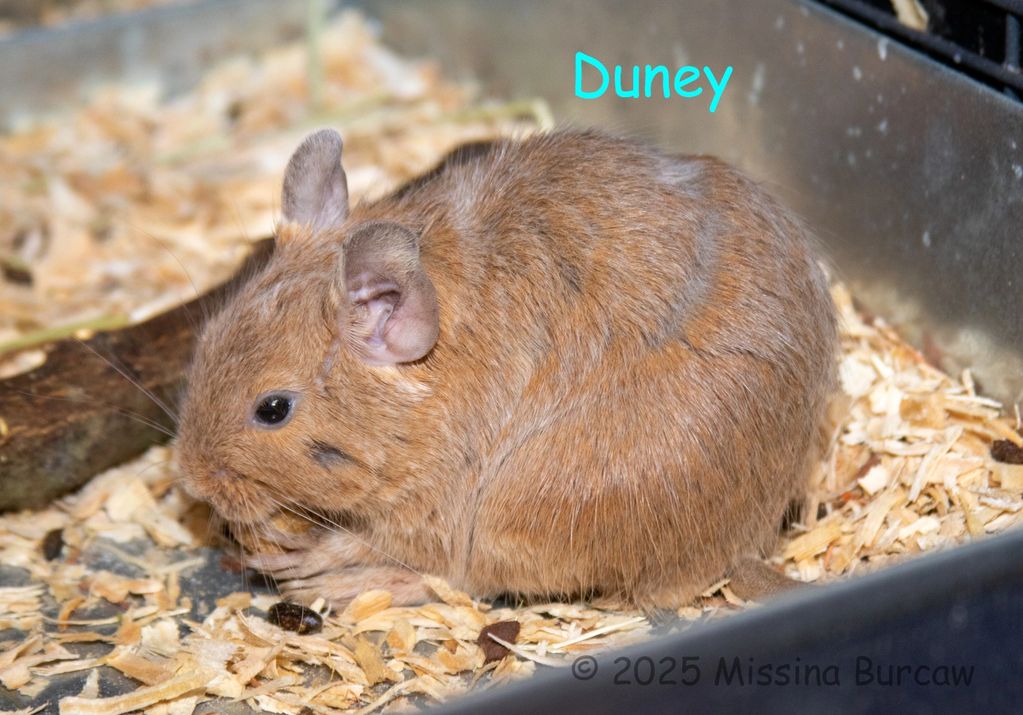 This is Duney, a sand color male degu. He *might* carry the blue gene. He is the newest addition to the Degu clan. Unfortunately its going to be some time before he can meet the ladies. Degu have a very rather interesting social order and he is an unknown male. The goal is to replace Ducan with him and pair him up with Jess and Mystic.