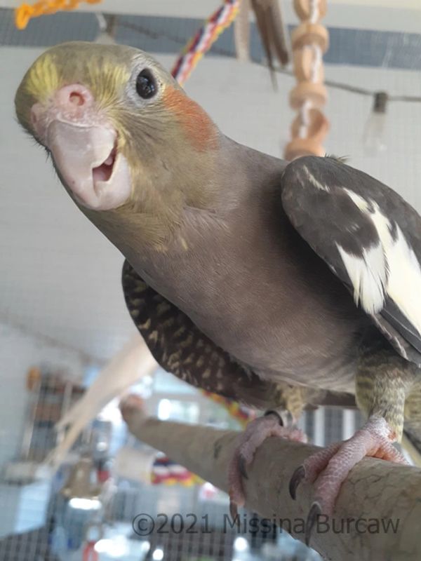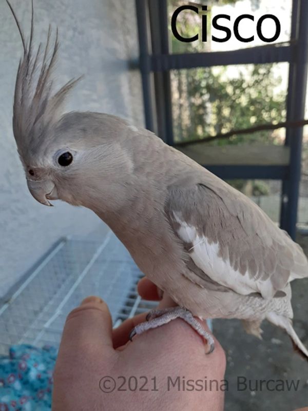 Cisco came to me with another female cockatiel in 2021. Her hatch date is believed to be in 2017. This is a very wonderful girl who will come when you call her name! She is a whiteface cinnamon and is mates with Gilligan.