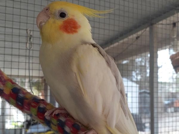 Dew Drop is a female lutino cockatiel that was produced by Beth Garcia in Brooksville. She was hatched in 2019. She is mates with both Sparrow Hawk and Ember-yes cockatiels will do love triangles!