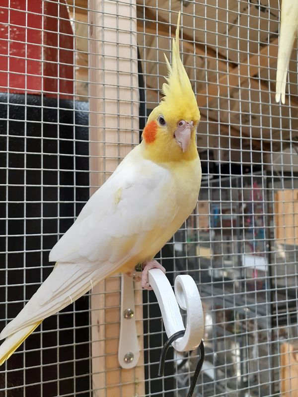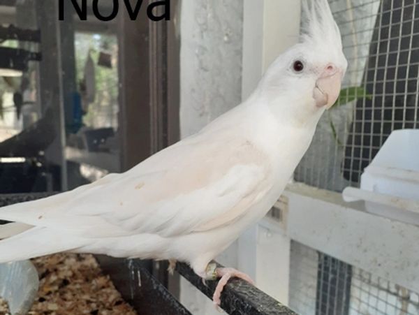 Nova is a whiteface lutino (some may say albino but that is incorrect). He was produced by Beth Garcia and I was able to hand raise him. He was hatched in October of 2020 and is mates with Dapple.