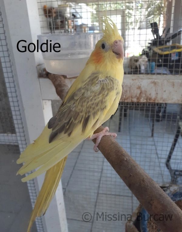 Goldie was born in 2018 and came to me from a fellow bird breeder. she was extremely ill when I got her, and it took a few months of TLC and a LOT of antibiotics to make her well again. Sadly she suffered an injury in the Fall of 2024 and passed away. Her life was to short, she burned bright and fast.