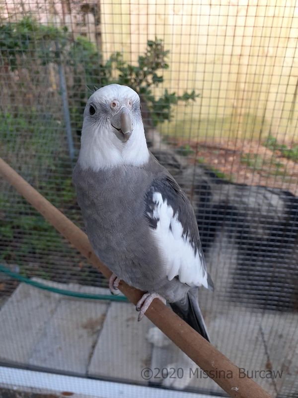 Named after a character from the Wheel of Time, Faile is a very lovely cinnamon pearl split to pied whiteface. She was hatched on 06/06/2020, and I purchased her from a breeder in Ocala, FL. She has produced some very nice babies with Jack. She is also a very friendly girl who will come and sit with you when you are in the aviary.
