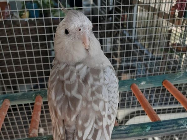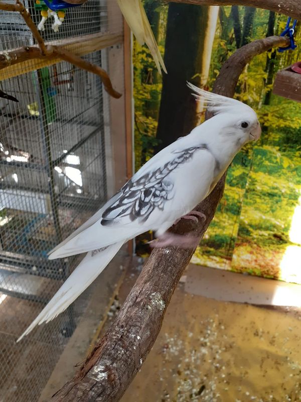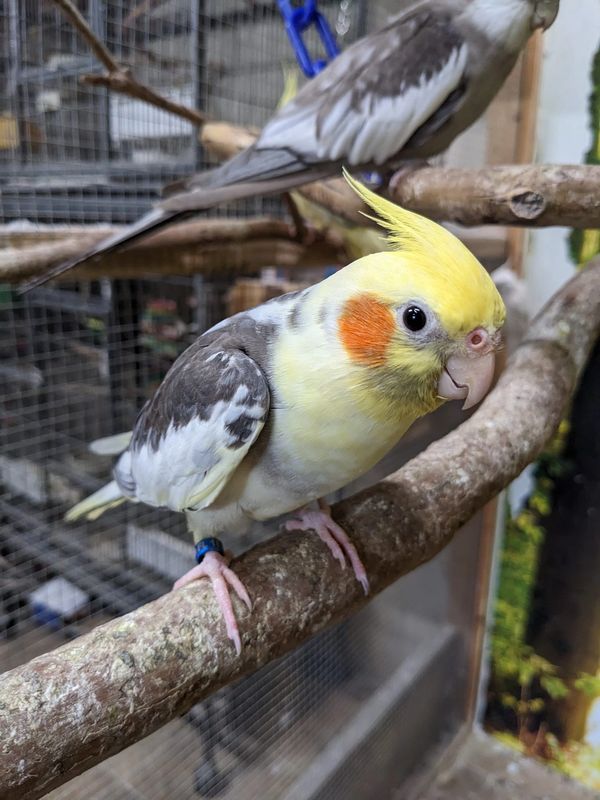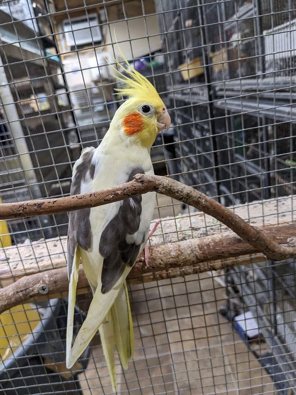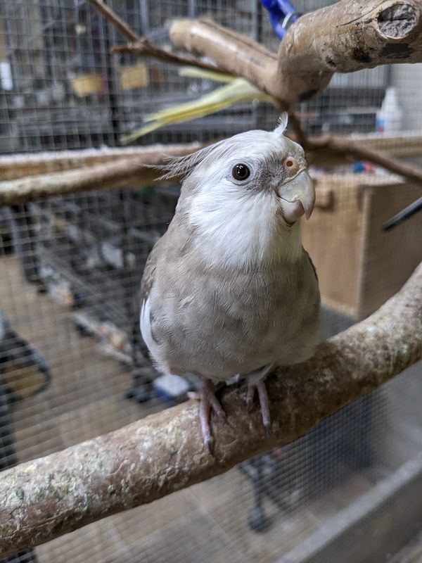 Baby is a very beautiful whiteface pearl pied cockatiel. She was picked up for me by a friend, and he regretted not keeping her for himself! She was born around March of 2022 and was weaned here. She is one of the most friendly cockatiels here and loves hanging out with people. I hope that one day she will pick out a mate and make some pretty babies for me.