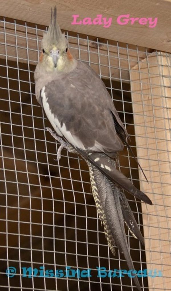 Lady Grey's exact age is not really known, but we estimate her to have been born around 2017. She is here as a retirement bird only. She does not ever want to come up to people and she has produced many babies in her life. Her mate passed away before she came to me. I think she is happy here and is flying around in the aviary with the rest of the cockatiels.