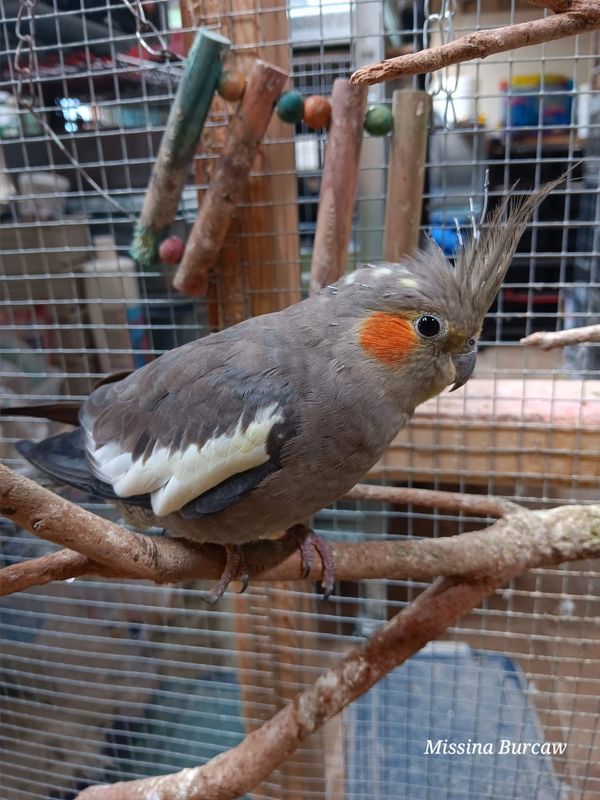 Sun Flower is a cinnamon pearl cockatiel split to whiteface and pied. I sold her, but her new family had to move, so she came back to me, and this is where she will stay. While she has several boys to choose from, she has remained within a mate and prefers to follow me around the aviary, trying to get head pats whenever she can. She hatched on 01/10/21 and is the daughter of Sparrow Hawk and Dew Drop.