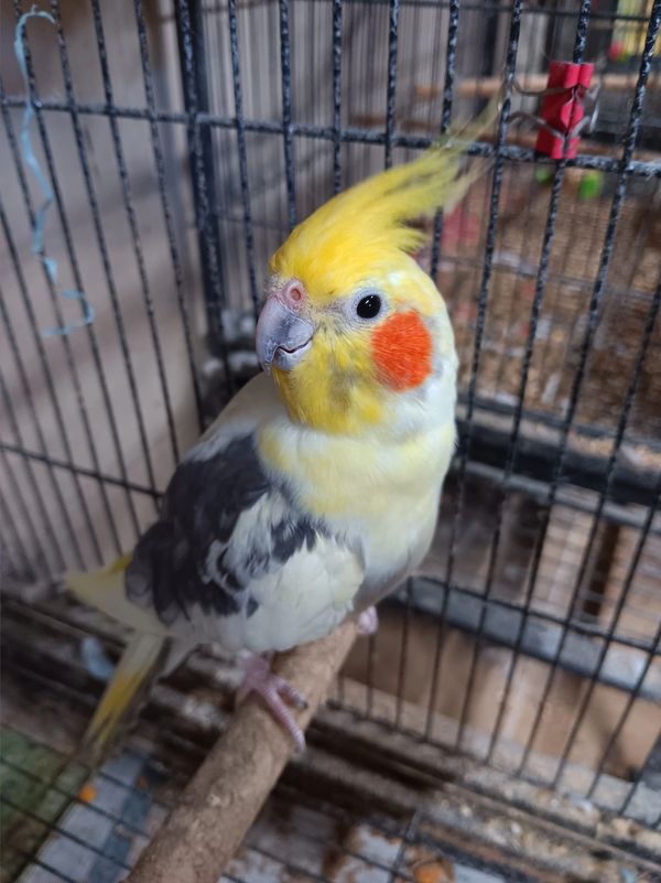 This handsome fellow was produced by Susan Graham. He is a pied cockatiel and hopefully will produce some pretty babies. I need a name for him still! I got him in 2024 and he was sold as a 1 year old.